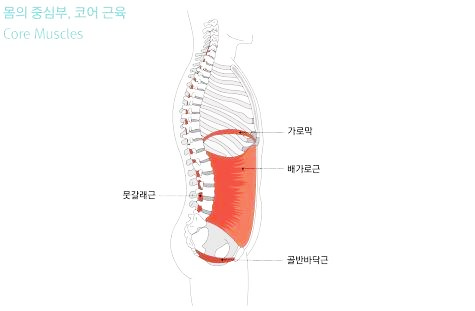 척추와 골반을 바르게 교정하는 것만큼 바른 척추를 유지할 수 있는 근육을 기르는 것이다. 즉, 몸의 중심부인 척추를 안정화시킬 수 있는 코어 강화 운동이 필요하다. 허리 , 인대, 디스크 등의 구조물이 약해도 근육이 강하게 받쳐주면 신체 구조를 바로 세울 수 있기 때문이다. 코어 근육 Core Muscles 은 등과 복부, 골반을 둘러싼 근육 복합체로서 척추와 골반을 보호하고 안정화시키는 역할을 한다.