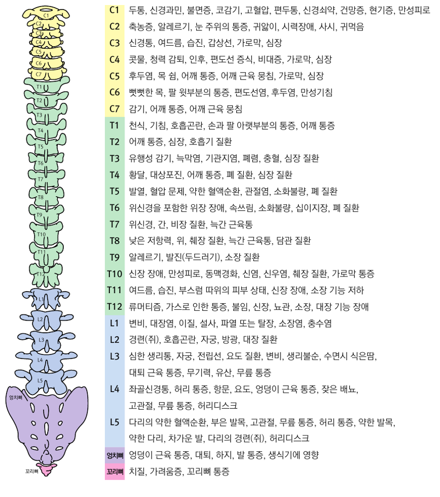 아래와 같은 자세로 본연의 척추 곡선에 변형이 오면 각 척추마다 연결된 질병은 아래 그림과 같다.